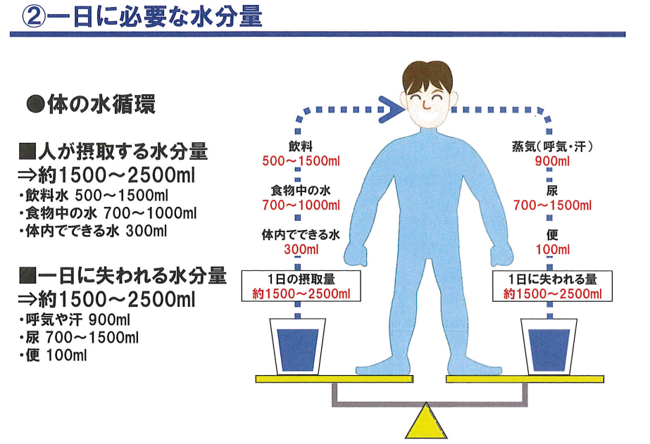Chất lỏng mà chúng ta hấp thụ qua nước uống được ruột hấp thụ và trở thành “chất lỏng cơ thể” như máu, lưu thông khắp cơ thể. Chất lỏng cơ thể đóng nhiều vai trò khác nhau liên quan đến cuộc sống của chúng ta. Chúng cung cấp oxy và chất dinh dưỡng cho các tế bào, và bài tiết các sản phẩm thải (chất thải từ cơ thể) dưới dạng nước tiểu. Khi nhiệt độ cơ thể tăng lên, chúng làm tăng lưu thông máu đến da, giải phóng nhiệt thông qua mồ hôi và giữ nhiệt độ cơ thể không đổi.