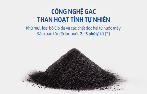 2. Công nghệ GAC: Than hoạt tính tự nhiên, có chất lượng và mật độ cao, khử mùi, loại bỏ Clo dư và các chất độc hại từ nước máy, đảm bảo tốc độ lọc nước 2-3 phút/L