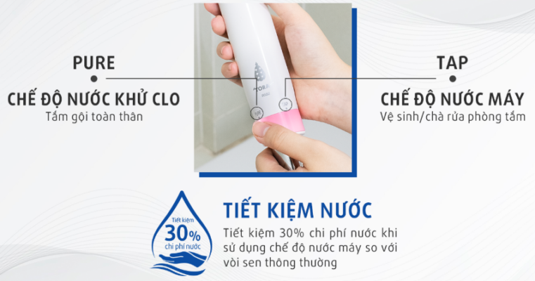 ● Người dùng có thể chuyển đổi sang dùng nước máy khi vệ sinh bồn hoặc phòng tắm, sang nước tinh khiết khi gội đầu và cơ thể. Đây là một chức năng tiện lợi cho phép bạn sử dụng vòi hoa sen một cách hiệu quả mà không lãng phí công suất lọc của lõi.